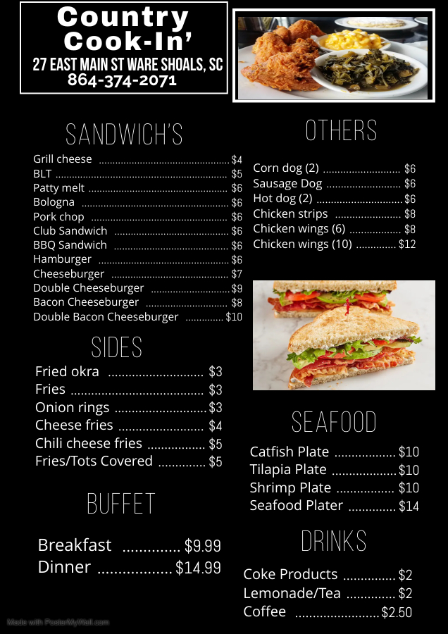 Welcome to Country Cook-In', where Southern hospitality meets mouth-watering dishes right in the heart of Ware Shoals, SC. Nestled at 27 E Main St, this eatery promises an experience filled with flavorful adventures and warm service.